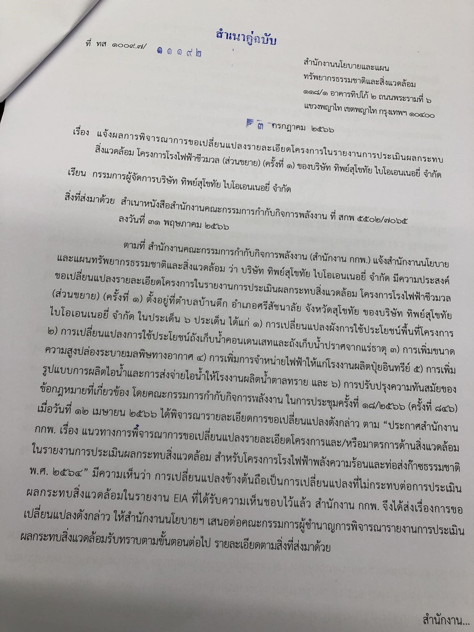 | 1 | รายงานการเปลี่ยนแปลงรายละเอียดโครงการในรายงานการประเมินผลกระทบสิ่งแวดล้อม โครงการโรงไฟฟ้าชีวมวล (ส่วนขยาย) (ครั้งที่ 2) ของบริษัท ทิพย์สุโขทัย ไบโอเอนเนอยี่ จำกัด | 3754 CH2 | 05/09/2568 |