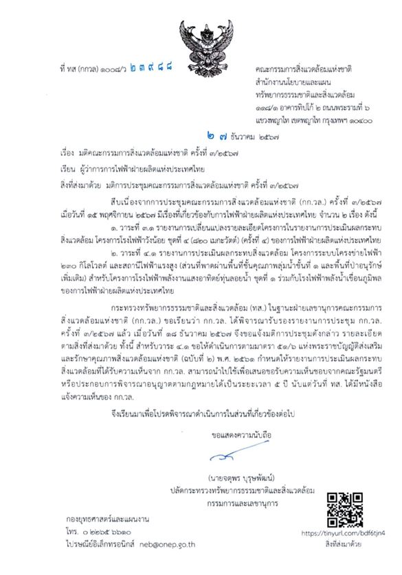 โครงการระบบโครงข่ายไฟฟ้า 230 กิโลโวลต์ และสถานีไฟฟ้าแรงสูง (ส่วนที่พาดผ่านพื้นที่ชั้นคุณภาพลุ่มน้ำชั้นที่ 1 และพื้นที่ป่าอนุรักษ์เพิ่มเติม) สำหรับโครงการโรงไฟฟ้าพลังงานแสงอาทิตย์ทุ่นลอยน้ำ ชุดที่ 1 ร่วมกับโรงไฟฟ้าพลังน้ำเขื่อนภูมิพล